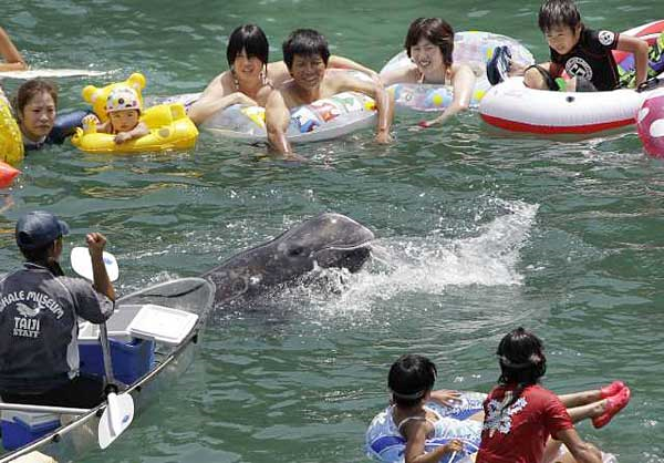 Perhaps it appears that people are having a good time, but really, look at that Risso dolphin … terrified and alone surrounded by unfamiliar people in an all too familiar place that represents the horror of Taiji!