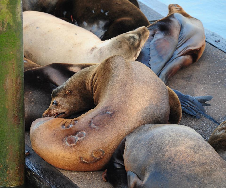 About 1,400 sea lions have been branded at Astoria since 1997 as part of a general population study. Numbers branded on the animals are used to identify sea lions  that go upriver to feed on endangered salmon at Bonneville Dam, where  the fish are vulnerable while waiting to go over the fish ladder.
