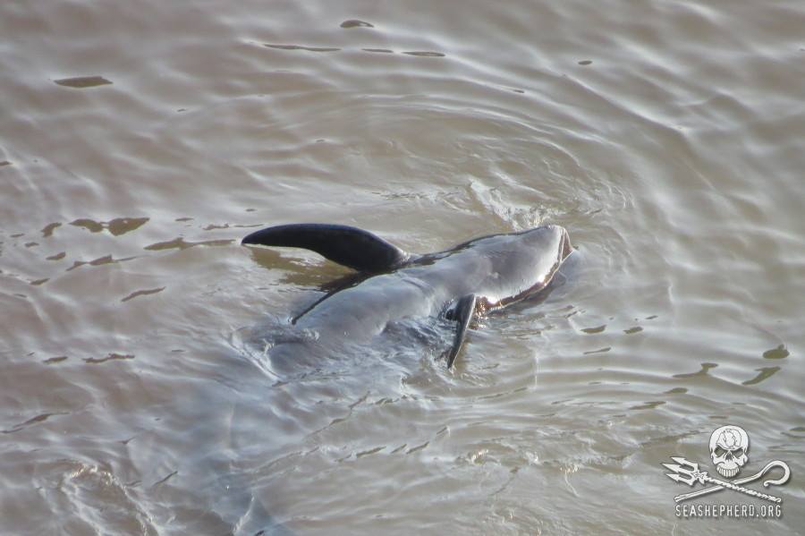 The trauma of the slaughter was simply too much for this Pilot Whale to bear as it continued to barely swim on its back after witnessing the slaughter of it’s family.