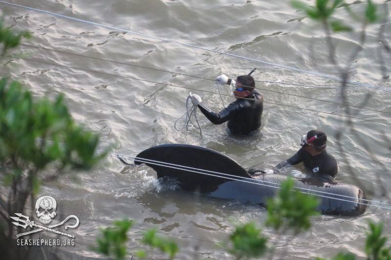 The killers tie ropes around the whales flukes to drag the to the shore of the killing cove.