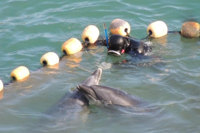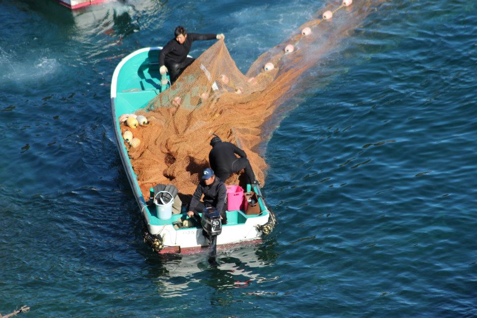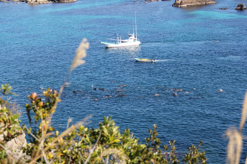There a dozen small fishing boats or “banger” boats in Taiji which are equipped with metal poles on their sides. These banger boats go out in the ocean off the coast of Taiji each morning at first light. The banger boats begin by fanning out and patrolling the known dolphin migratory routes looking for dolphins or small whales. Once a hunting boat finds a pod, it will continue to follow the pod until five or more hunting boats arrive. At this point the banger boats begin to herd the dolphins using their boats by banging with a hammer on a flange on the top of the poles. The banging on these poles creates a wall of sound from which the dolphins swim away. This in itself is the Drive Hunt. The dolphins are driven past the entrance to Taiji harbour and then into the entrance of the Cove. The rock spurs, islets and shallows create a natural funnel right into the entrance of the Cove. Once the dolphins are past this entrance other dolphin hunters will seal off the entrance with nets.
